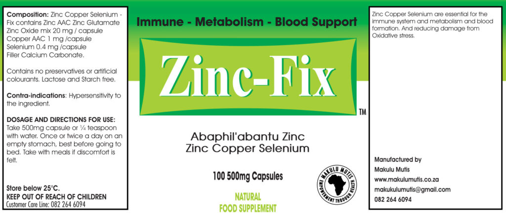Zinc Copper Selenium – Fix contains ZincAAC Zinc Glutamate Zinc Oxide mix 20 mg / capsule, Copper AAC 1 mg / capsule. Selenium 0.4 mg / capsule. Filler Calcium Carbonate.